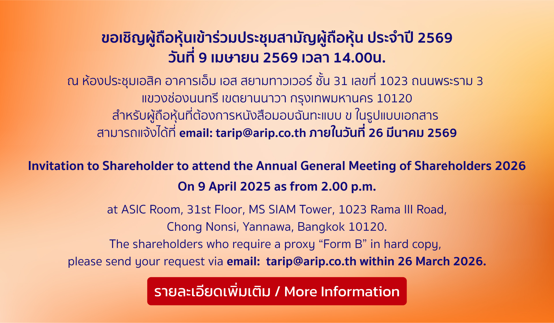 นายบุญเลิศ นราไท ประธานเจ้าหน้าที่บริหาร บริษัท เออาร์ไอพี จำกัด (มหาชน) และทีมผู้บริหาร ร่วมมอบทุนการศึกษาให้กับวิทยาลัยการจัดการ มหาวิทยาลัยมหิดล เพื่อสนับสนุนงานด้านการศึกษา ตลอดจนกิจกรรมด้านวิชาการต่าง ๆ ของทางมหาวิทยาลัยฯ โดยมีรองศาสตราจารย์ ดร.ปรารถนา ปุณณกิติเกษม คณบดีวิทยาลัยการจัดการ และ รองศาสตราจารย์ ดร.สุภรักษ์ สุริยันเกียรติแก้ว ผู้ช่วยคณบดีหน่วยธุรกิจและสังคมสัมพันธ์ พร้อมด้วย ผู้ช่วยศาสตราจารย์ ดร.บุญยิ่ง คงอาชาภัทร หัวหน้าสาขาการจัดการ มหาวิทยาลัยมหิดล ร่วมรับมอบ ณ วิทยาลัยการจัดการ มหาวิทยาลัยมหิดล พร้อมกันนี้ยังร่วมกันหารือถึงความร่วมมือระหว่างวิทยาลัยฯ และ ARIP ที่มุ่งหวังจะร่วมผลักดันให้เกิดการเปลี่ยนแปลงในภาคเอกชนในอนาคตต่อไป